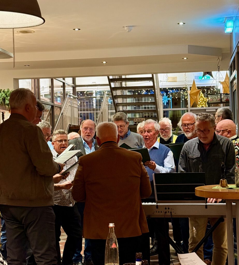 Im Anschluss haben wir unter der Leitung von Jürgen am Piano und mit Unterstützung von Edi die Lieder „Ich glaube“, „Advent du stille Zeit“, „Little Drummer Boy“ und „Weihnachten bin ich zu Haus“ gesungen. Alles hat wunderbar geklappt und Jürgen hat wie immer sehr schön begleitet…