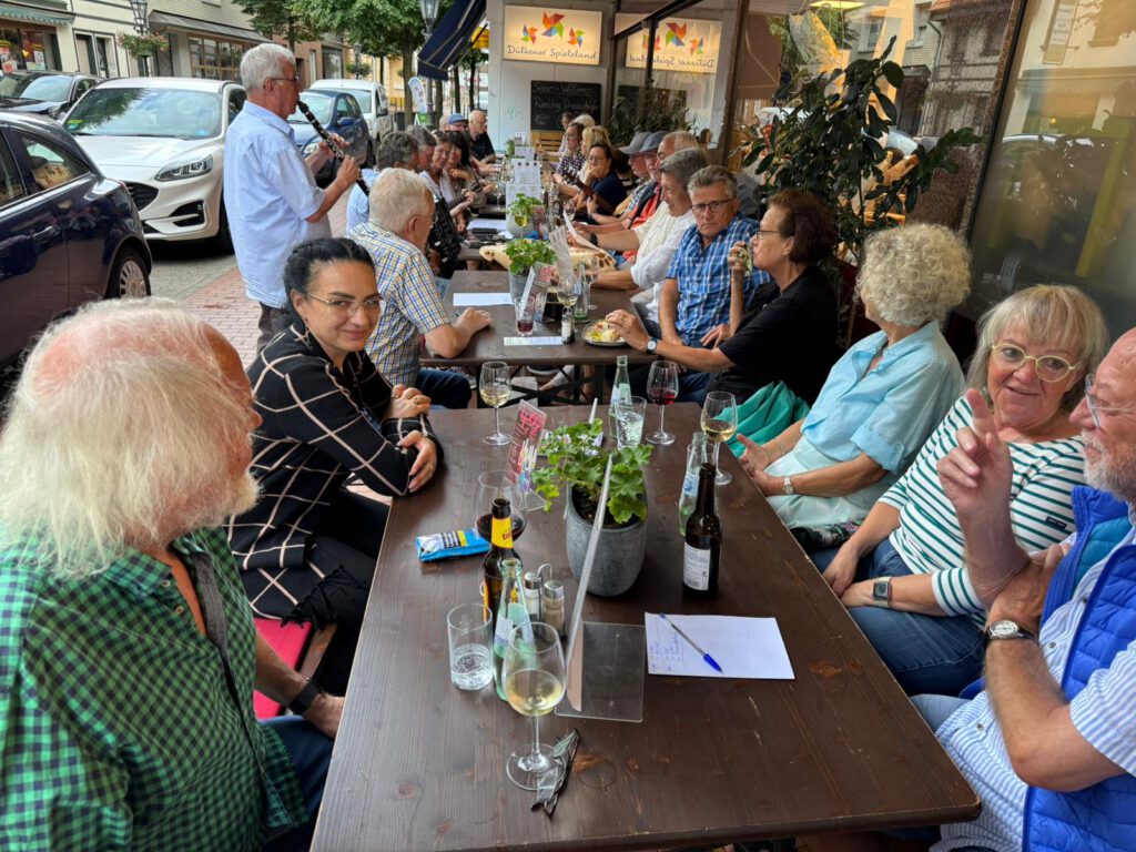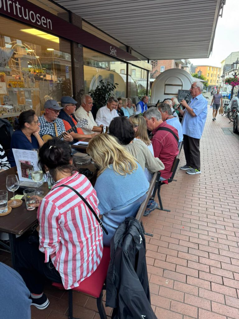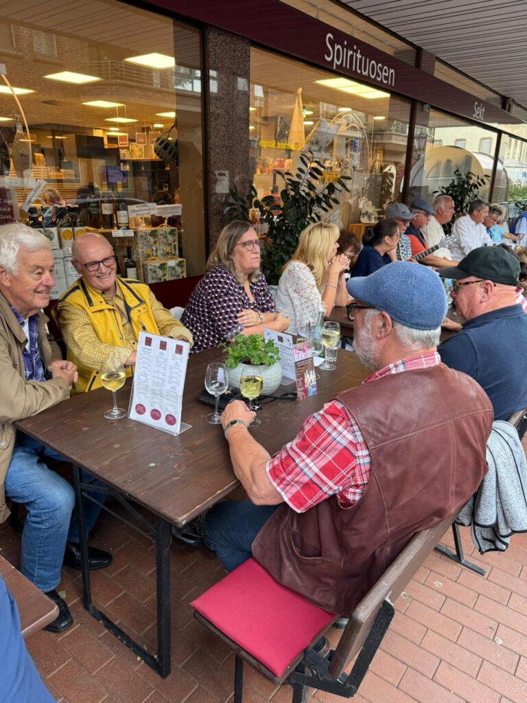am vergangenen Donnerstag trafen die ersten Sänger mit unseren Frauen bereits um 16:30 Uhr bei der Wein Gang in Dülken ein. Schnell füllten sich die Tische und am Ende waren wir sogar mit 30 Teilnehmern unserer Liedertafel Familie dabei. Bei angenehmen Temperaturen spielte zu Beginn das Lita-Trio unter musikalischer Unterstützung von Klaus Lammertz auf. Neben „Spanish Eyes“, „Pepito“ und „All of Me“ durfte auch das „Fly me to the Moon“ mit gesanglicher Begleitung von Markus nicht fehlen. Schnell kam gute Stimmung auf und die Liedertafel-Sänger trugen unter dem Dirigat von Dolli „Ein Prosit der Gemütlichkeit“, „Die Getränke sind frei“, „Lebe, liebe, lache“ und noch einige Trinksprüche vor. Natürlich durfte auf besonderen Wunsch von Dennis von der Wein Gang „Das Steigerlied“ nicht fehlen. Im Anschluss übernahm unser musikalischer Leiter Jürgen am Akkordeon die Initiative und spielte mit dem erweiterten Trio – Weinlieder, Seemannslieder und vor allem kölsche Lieder aus unseren Lieder Potpourris.